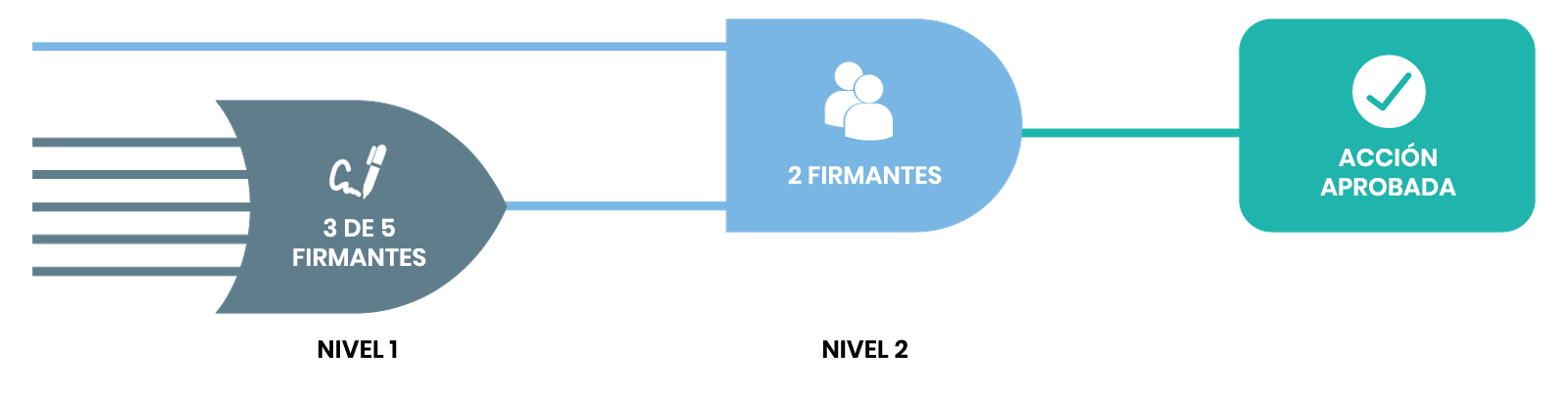 Además, la función de niveles múltiples ayuda a escalar la transacción de un nivel a otro para la ejecución final. Cada vez que un número requerido de signatarios aprueba una transacción, se reenviará al siguiente nivel y así sucesivamente. Esto crea un proceso de aprobación de transacciones de múltiples capas que no es posible en todas las infraestructuras de blockchain.