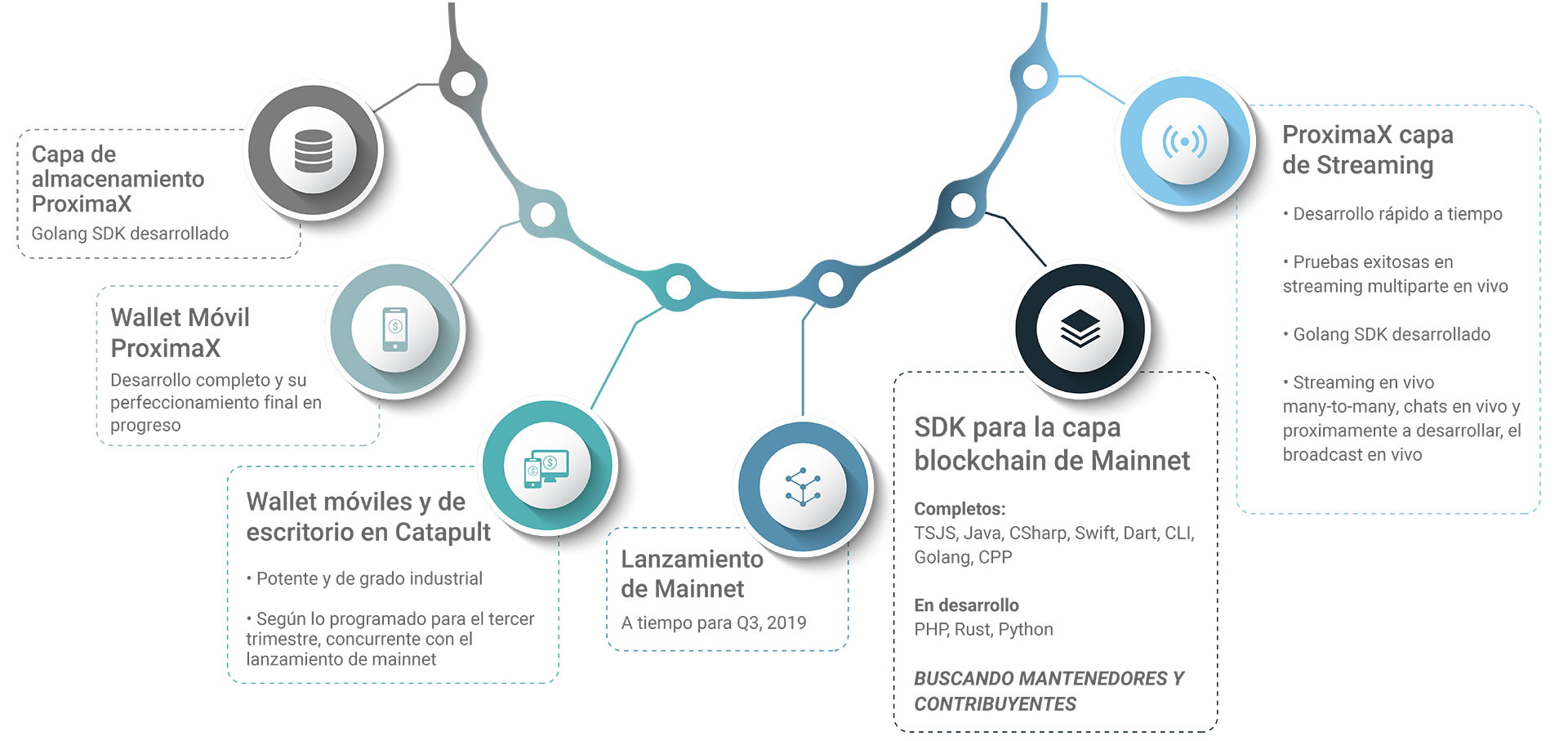 La mainnet pública tiene buen avance y estamos en contínua revisión para estar a tiempo. Al momento de escribir este artículo, hemos terminado de desarrollar una nueva wallet móvil completamente renovada. Planeamos lanzarla pronto, estamos a la espera de un mayor refinamiento y corrección de errores. También hemos desarrollado una wallet móvil de grado industrial basada en la última versión de Catapult. Tras el lanzamiento de la red principal de ProximaX, se hará un lanzamiento simultáneo de las wallets móviles y de escritorio Catapult. La wallet de escritorio tendra una gran mejora, teniendo en cuenta la integración de las capas de streaming y almacenamiento que forman parte de la oferta de la solución ProximaX.