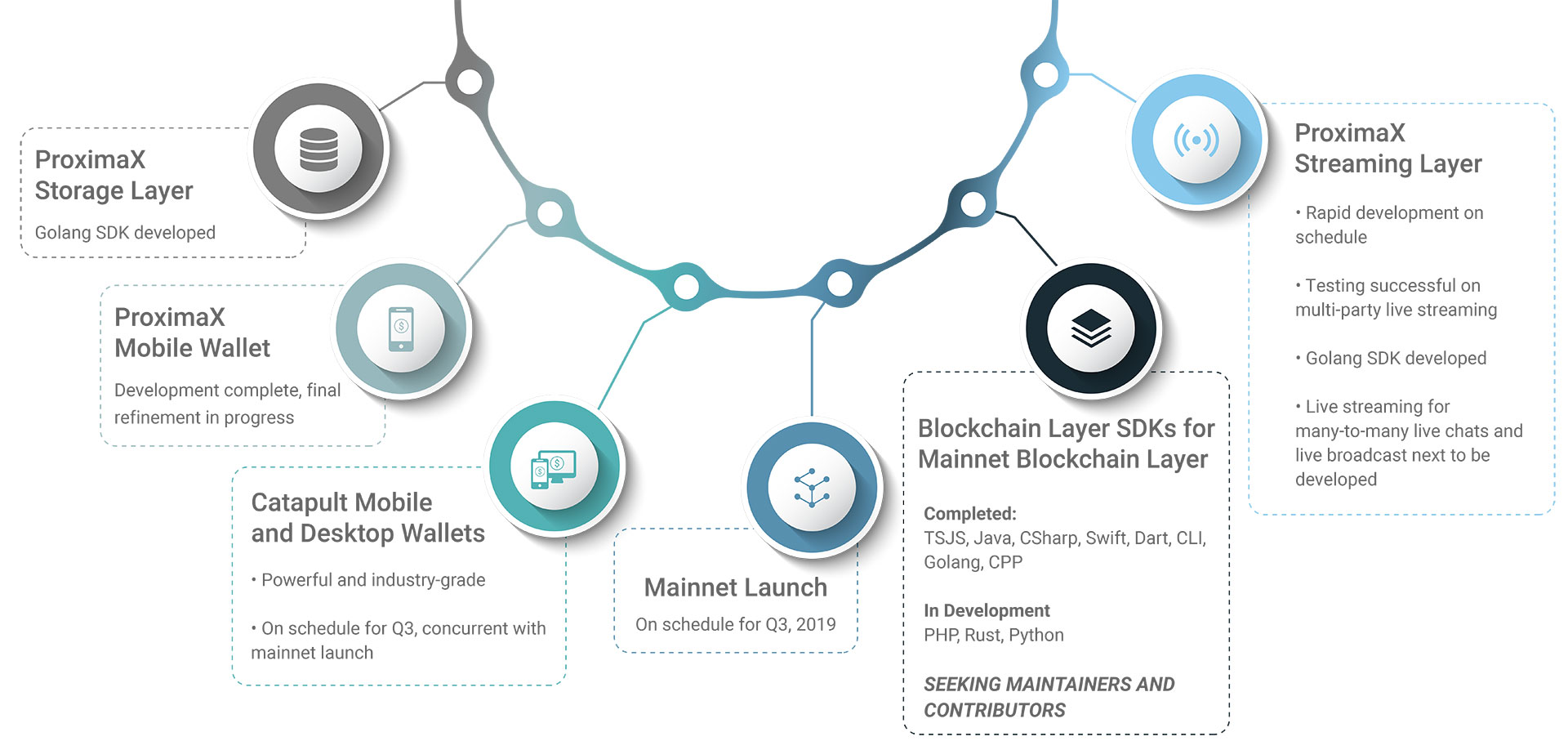 The public mainnet is coming along well and we are looking very much to be on schedule. At the time of this writing, we have finished developing a completely revamped new mobile wallet. We plan on launching it soon, pending further refinement and bug fixing. We have also developed an industry grade mobile wallet based on the latest Catapult release. Upon the rollout of the ProximaX mainnet, we should see a concurrent release of the Catapult mobile and desktop wallets. The desktop wallet shall be very much enhanced, taking into consideration the integration of the streaming and storage layers that are part of the ProximaX solution offering.