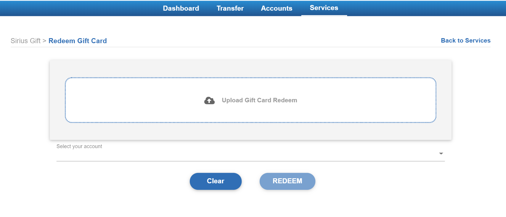 Once logged on, navigate to the Services tab and click on Redeem in the drop down underneath the Sirius Gift icon.