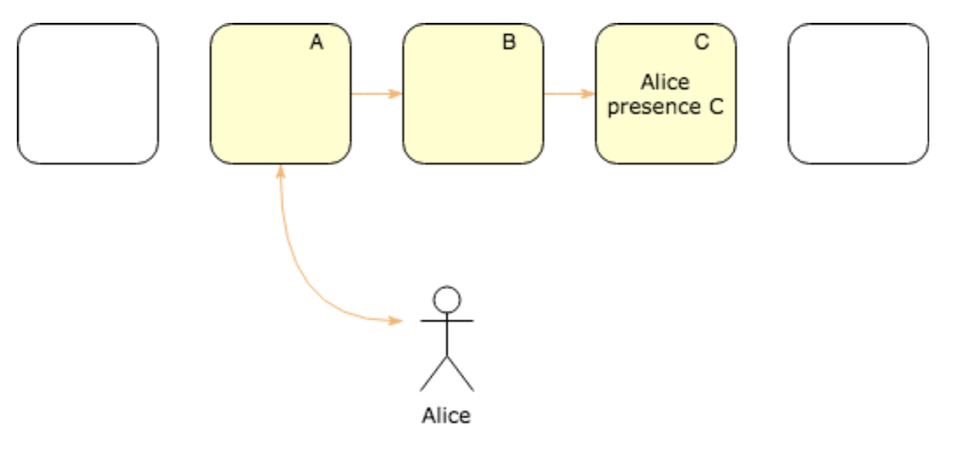 In order for a client to establish its presence in the system without revealing her identity, we obfuscate the user presence node from her real entry point. A client registers one or multiple points of contact for herself (we call these points “presence nodes”). To do that, a client discovers three independent nodes on the network, selects which node becomes her entrance node, which node becomes her presence node, and uses the onion-style telescopic connection.