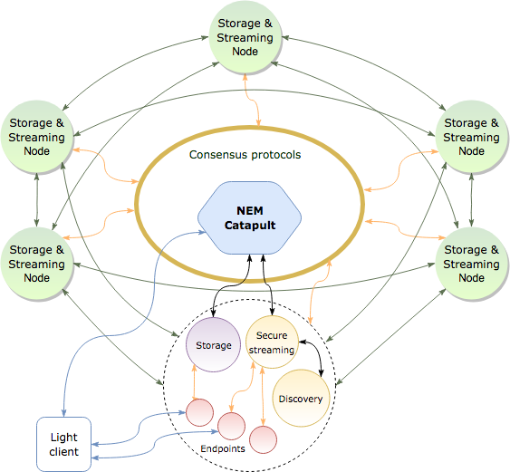 With NEM’s Catapult, we’ll be able to take advantage of its pre-defined/built-in smart business rules and logic, and plugin mechanism. We’re going to use it to store proof statistics and reputation inputs, and our very own Proof of Conflation Aggregate Selection and Market. In September, we built the design on how each Catapult feature can be used to support our ecosystem of storage and streaming nodes.