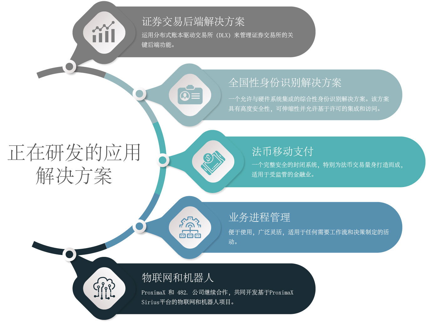 除了在ProximaX Sirius基础设施平台上取得的进展外,我们还正在该平台上由自己或合作伙伴来构建许多新的垂直应用程序,诸如证券交易后台解决方案,全国性身份识别解决方案PoC,专为法币打造的移动支付解决方案以及业务进程管理解决方案。下面我将一一做以阐述。